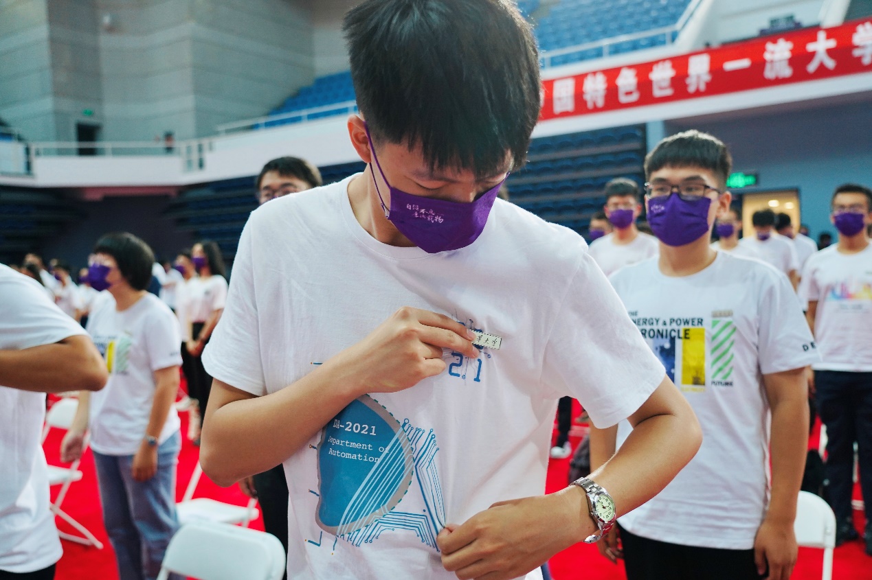 Tsinghua University Council Chairperson Chen Xu wore the Tsinghua badge for the freshmen representative.