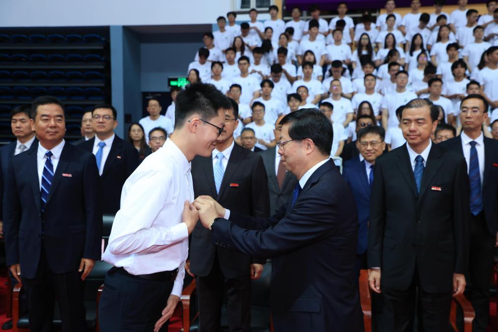 At the opening ceremony, a special segment featured the presentation of Tsinghua University badges to new students. Qiu Yong pinned a Tsinghua badge for a graduate student representative.