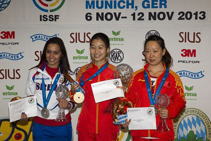 Tsinghua University student Yi Siling won a gold medal with 210.3 points in the final of the 10m Air Rifle Women event at the 2013 ISSF Rifle and Pistol World Cup, held in Munich on November 10.