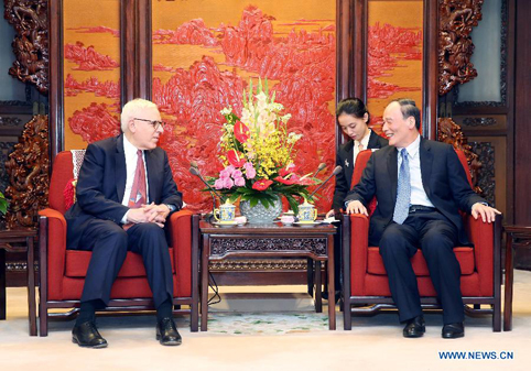 Wang Qishan (R), a member of the Standing Committee of the Political Bureau of the Communist Party of China (CPC) Central Committee and secretary of the Central Commission for Discipline Inspection (CCDI) of the CPC, meets with Chairman of the Advisory Board of Tsinghua University School of Economics and Management David M. Rubenstein (L), who is also co-founder and co-CEO of The Carlyle Group, in Beijing, capital of China, Oct. 24, 2014. (Xinhua/Yao Dawei)