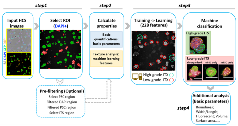 To facilitate the efficient and unbiased analysis of the stem cell-based embryo model, the team set up a workflow to use machine learning-assisted high-content analysis to study embryo-like structures derived from several induced pluripotent stem cell (iPSC) lines and embryonic stem cell (ESC) lines. Moreover, using this system, the team screened 55 small molecules and cytokines and found that BMP4 was the best candidate to facilitate the formation and the development of the iPSC/ESC and trophectoderm stem cell assembled embryos termed ITS or ETS embryos.