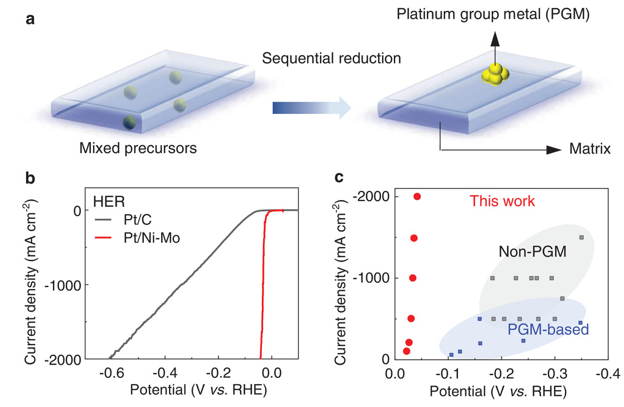 Led by TBSI Associate Professor Bilu Liu and SARI Professor Jiong Li, the team has synthesized a new type of electrocatalyst where trace precious metals are strongly anchored on corrosion-resistive matrix. As an example, the produced Pt/Ni-Mo electrocatalyst only needs an overpotential of 113 mV to reach an ultrahigh current density of 2000 mA cm-2 in saline-alkaline electrolyte, standing as the best performance reported so far. It shows high activity and long durability in various electrolytes and under harsh conditions, including strong alkaline and simulated seawater electrolytes, and under elevated temperatures up to 80 ºC. This electrocatalyst is produced on a large scale at low cost and shows good performance in a commercial membrane electrode assembly stack, demonstrating its feasibility for practical water electrolysis.