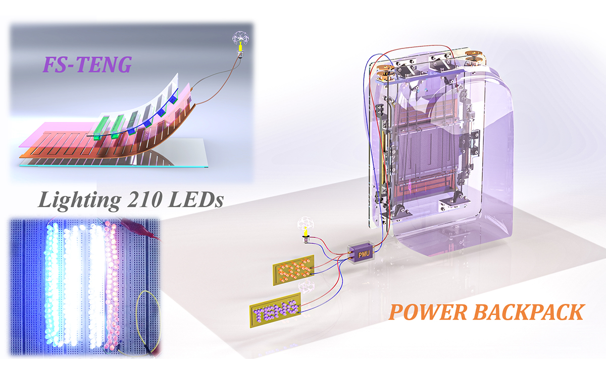A triboelectric nanogenerator (TENG) attached to a load-suspended system within a backpack can help convert mechanical energy into power for LEDs. It has great potential to create enough electricity to support a phone and/or navigation device.