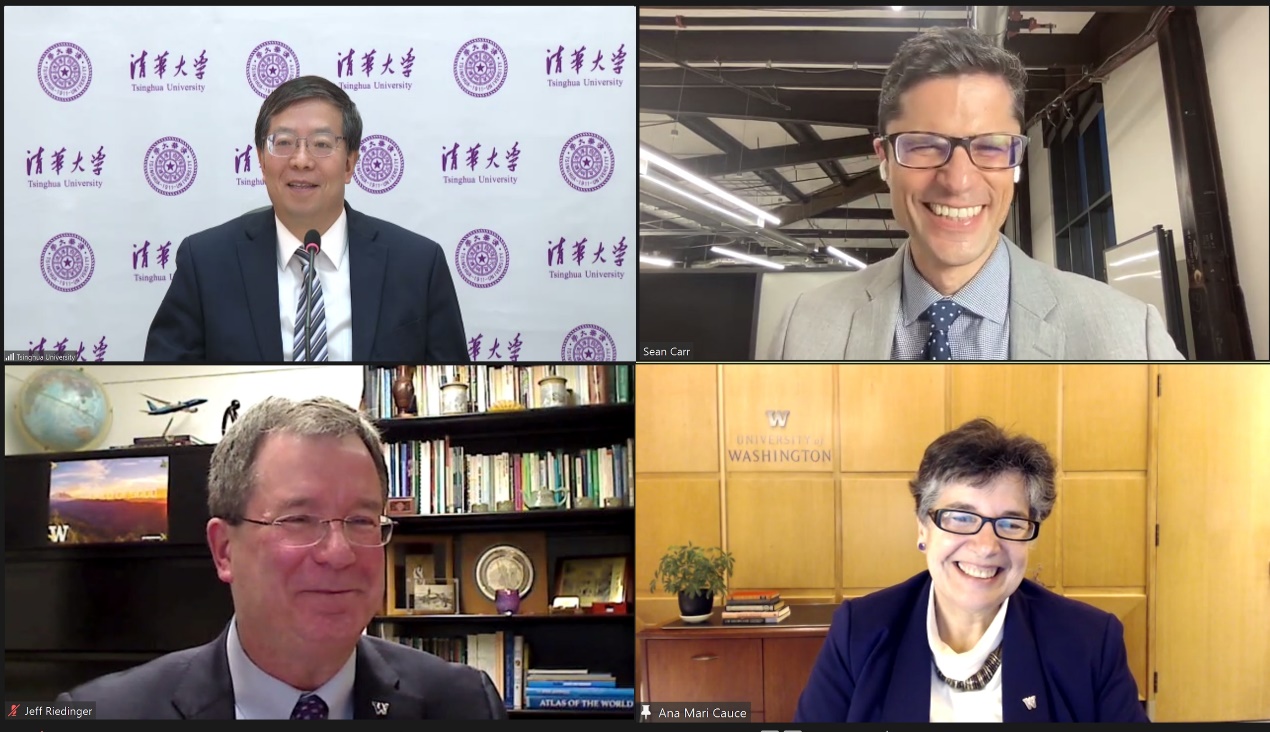 Tsinghua President Qiu Yong and President of the University of Washington Ana Mari Cauce held a virtual meeting on Thursday.