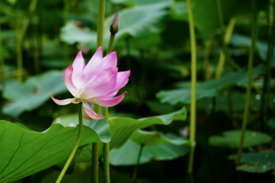 Lotuses enjoy a high reputation of being pure, noble, elegant, and faithful. The unfolding leaves scatter randomly in various sizes, adding life to the pond. The dew rolls back and forth on the leaves, shining like pearls in the light.