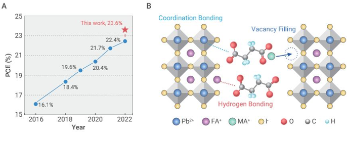 In this work, the authors introduced a succinate additive into the perovskite precursor to improve the quality of perovskite films and the performance of perovskite solar cells. The carboxylic acid group in the succinate anion can interact with the formamidinium cation via hydrogen bonding, and can coordinate with the dangling lead atom in the perovskite lattice. Methylammonium cations can fill cation vacancies on the surface of perovskite grain. These various interactions lead to the suppression of defect states in the perovskite film and the relaxation of microstrains, resulting in a high-quality perovskite film for photovoltaic applications.