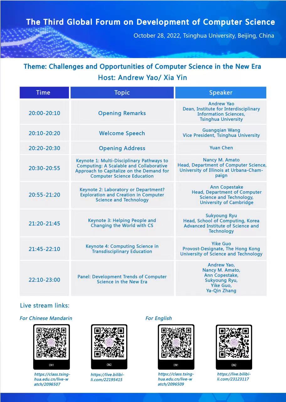 In this year, the Third Global Forum on Development of Computer Science will be held at 20:00-23:00 Beijing Time on October 28. The theme of this global forum is ‘Challenges and Opportunities of Computer Science in New Era’, which aims to bring together the Heads/Deans of top computer science departments/schools and leading computer scientists in the world to discuss the fundamentals of computer science, promote the development of global computer science discipline, improve the quality of talent cultivation, enhance communication and cooperation between computer science departments, and explore the role of computer science in university development strategy and interdisciplinary opportunities for computer science.