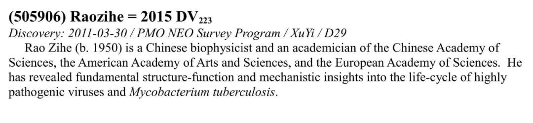 In a statement released on October 3, minor planet No.505906 was named after Rao Zihe, a molecular biologist and member of the Chinese Academy of Sciences (CAS), by the Working Group for Small Bodies Nomenclature of the International Astronomical Union (IAU) in recognition of his outstanding contributions in the research of pathogenic viruses and mycobacterium tuberculosis.