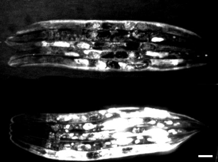 Two Caenorhabditis elegans nematode worms 60 mins after they have been fed after being starved. The top worm is a wild type and shows less translation of proteins associated with egg yolks than the bottom, in which the trl-1 gene is deleted.