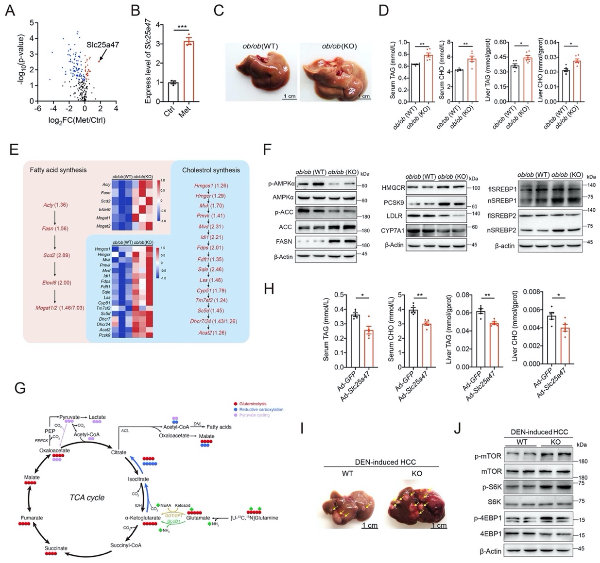 The study used CRISPR/Cas9 technology to construct Slc25a47 gene knockout (KO) mice and found that Slc25a47-KO mice showed more obvious liver lipid accumulation under the conditions of methionine-choline-deficient feed or high-fat feed. Subsequently, the research team constructed ob/ob (Slc25a47-KO) mice and found that compared with the control group ob/ob (WT) mice, ob/ob (Slc25a47-KO) mice had increased lipid accumulation in the liver (Figure 1C), increased triglyceride (TAG) and cholesterol (CHO) levels in serum and liver tissue (Figure 1D). RNA-sequencing results showed that compared with ob/ob (WT) mice, the expression of multiple genes related to fatty acid and cholesterol synthesis increased in the liver of ob/ob (Slc25a47-KO) mice (Figure 1E). Finally, it was found that Slc25a47 knockout promotes the activation of the sterol regulatory element binding proteins (SREBPs) by inhibiting AMPKα phosphorylation, thereby regulating the expression of many lipogenic genes, promoting lipid synthesis, and causing more lipid accumulation in the liver of ob/ob (Slc25a47-KO) mice (Figure 1F). Furthermore, the research team used 13C-metabolic flux analysis to find that the primary hepatocytes of Slc25a47-KO mice mainly use amino acids to provide energy for lipid synthesis (Figure 1G). In addition, overexpression of Slc25a47 in mouse liver can inhibit SREBPs activation by promoting AMPKα phosphorylation, slowing down lipid accumulation in the liver of high-fat diet mice (Figure 1H).