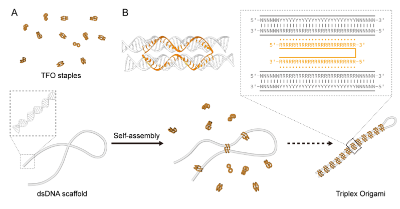 Inspired by the structural characteristics of DNA triple helices, the authors managed to apply triplex to the self-assembly of dsDNA. DNA triple helix is formed by incorporating a third strand (TFO) into the major groove of the dsDNA through Hoogsteen or reverse Hoogsteen base pairing. When a TFO strand was designed into two parts, each part can independently recognize a specific site on a long dsDNA backbone to draw close distant segments. With the collective binding of a set of TFO staples, the dsDNA backbone folds into designer nanostructures, in which the connections among its many binding sites can form a complex and orderly network.