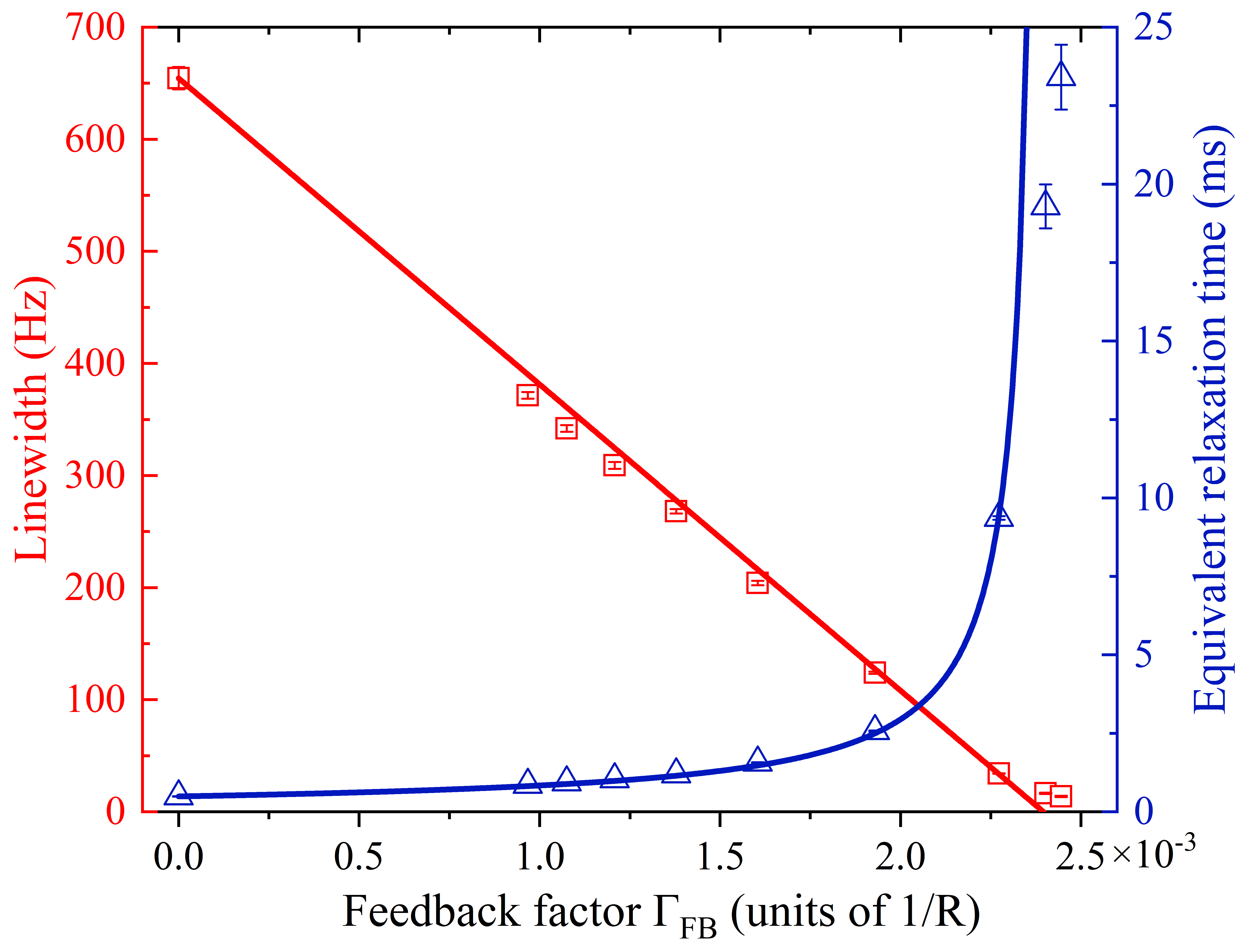 They realized a novel type of parity-time-symmetric (PT-symmetric) system by utilizing a single resonance mode, which leads to efficient and tunable linewidth narrowing. In recent years, PT symmetry has attracted much interest, inspired by its unique property that exhibiting real energy spectra with non-Hermitian. The study of PT symmetry provides a powerful tool of engineering gain and loss and controlling the system linewidth. However, previous realizations of PT symmetry require two or more modes, which is not applicable in a large variety of systems which contain only a single resonance mode. They found that a single resonance system has two orthogonal quadrature. By constructing a quadrature measurement-feedback loop in which one quadrature component is measured with feedback [Fig1. (b)], an equivalent gain is introduced, breaking the symmetry between the quadratures and realizing a PT-symmetric system. By adjusting the feedback factor, the eigenvalues of the system can be controlled [Fig. 1(d)-(e)]. In the PT symmetric phase (orange area), the imaginary parts (dissipation) of the system's eigenvalues decrease with the increase of the feedback factor, resulting in a narrowing of the linewidth.