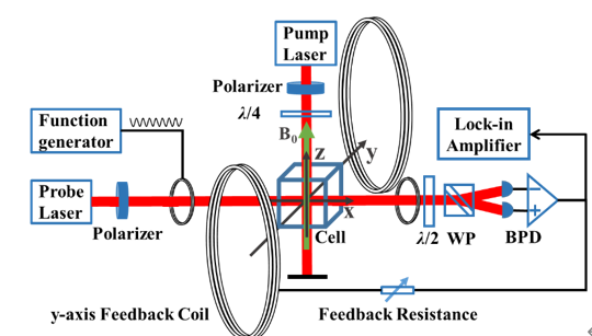 They demonstrated the PT-symmetric feedback mechanism in a thermal atomic ensemble, which is a typical example of magnetic resonance system. A beam of circularly polarized laser propagating along the −z direction optically pumps the atomic ensemble to polarize the collective spin. A static magnetic field is applied along z axis, then the collective spin undergoes a Larmor precession around z axis. Thus the transverse components Px,y oscillates in the xy plane, constituting a harmonic oscillator. They measured the spin polarization component Px using a probe laser via polarization homodyne detection, and the output signal is then fed into a loop that includes a feedback resistor and the y-axis feedback coil, which generate the feedback magnetic field. The effect is that the gain is introduced into the Px orthogonal quadrature, breaking the symmetry of Px and Py, making the collective spin oscillator become a PT-symmetric system.