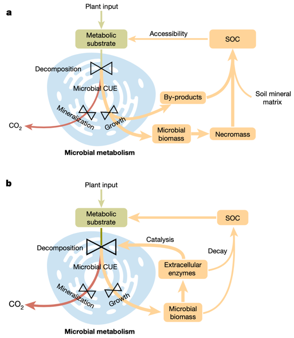 The authors investigated the role of microbial processes in global soil carbon storage by employing microbial carbon use efficiency. Microbial carbon use efficiency captures the dual control point by microorganisms by indicating how much carbon was used for growth versus how much was used for metabolism. A high carbon use efficiency may result in either an increase in microbial by-products and dead biomass with enhanced growth, which contributes to soil organic carbon accumulation, or an increase in enzyme production that catalyzes organic matter decomposition, which results in soil organic carbon loss (Figure 1).
