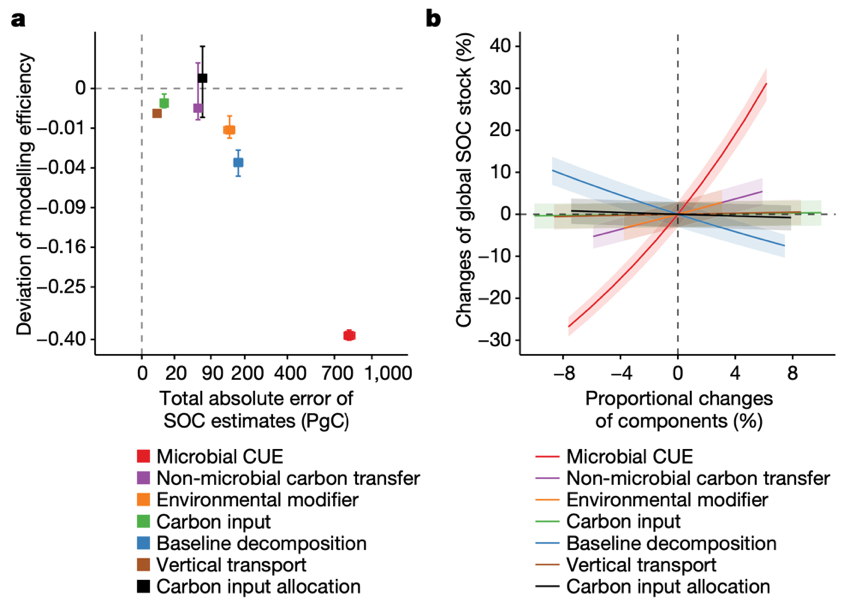 In addition, the authors found that microbial processes are the major determinant of soil carbon storage at the global scale. Specifically, representing the spatial patterns of microbial carbon use efficiency is essential for the process-based model to accurately simulate the global soil organic carbon and its distributions. Microbial carbon use efficiency is at least four times more important than any other investigated processes, including biomatter decomposition and plant carbon inputs (Figure 4).