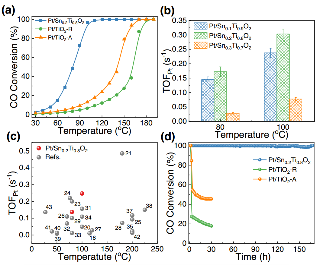 The results of the activity tests revealed that among the Pt catalysts with the same Pt loading, Pt/Sn0.2Ti0.8O2 exhibited the highest CO oxidation activity, indicating the significant role of Sn doping in promoting low-temperature CO oxidation. Moreover, Pt/Sn0.2Ti0.8O2 demonstrated excellent sulfur resistance and water tolerance.