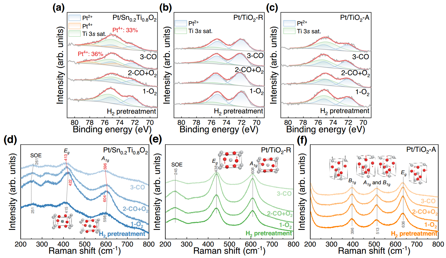 Throughout the entire in situ NAP-XPS study, no peaks corresponding to metallic Pt species were detected. After H2 pretreatment, only Pt2+ was observed, and no Pt4+ species were observed even after further O2 treatment. However, Pt/Sn0.2Ti0.8O2 exhibited the formation of Pt4+ species upon CO + O2 introduction, and Pt4+ species were only present during CO flow. Such phenomena were not observed for Pt/TiO2-R and Pt/TiO2-A catalysts. Furthermore, on the surface of Pt/Sn0.2Ti0.8O2, the oxidation of Pt2+ to Pt4+ and CO oxidation occurred simultaneously, indicating the migration of lattice oxygen to Pt sites followed by CO oxidation to CO2, thus confirming the occurrence of ROS. In the in situ Raman spectra, all peaks were attributed to Ti-O vibrations, but only the Pt/Sn0.2Ti0.8O2 catalyst exhibited peak shifts, indicating a change in the oxygen coordination environment within the support and providing additional evidence for the occurrence of ROS.