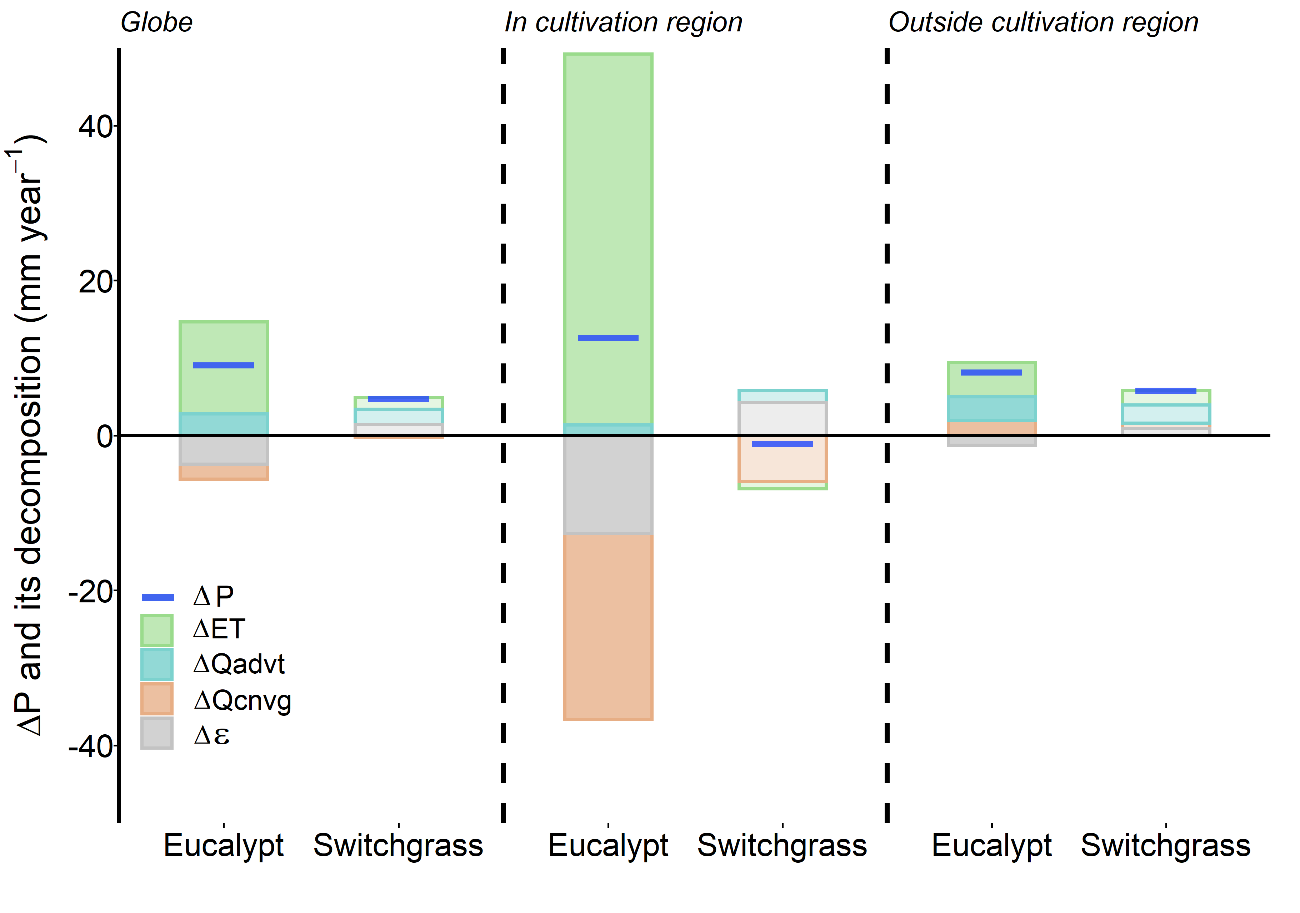 A dynamic vegetation model with a specific bioenergy crop module (ORCHIDEE MICT) coupled with a general circulation model (LMDZ) was used to simulate the biophysical characteristics and key hydrological variables in six bioenergy crop cultivation scenarios and one reference simulation. It was found that cultivation of eucalypt and switchgrass will increase the mean annual precipitation over global land by 9.0±2.4 mm year-1 and 4.7±2.7 mm year-1, respectively, and 15.5% and 11.9% of land areas show significant changes (Fig. 1). From the precipitation diagnosis based on the atmospheric water vapor budget equation, ET is the main source of precipitation increase in the eucalypt scenarios, while the increased precipitation results from both ET and moisture advection (Qadvt) in the switchgrass scenarios (Fig. 2). The increased precipitation and reduced runoff can partially offset the water consumption by the bioenergy crop growth. This study reveals the importance of the biophysical effects of land use change on the climate system and the terrestrial water cycle. Both the biogeochemical and biophysical effects of land-based climate mitigation measures should be comprehensively evaluated in order to formulate more effective climate change mitigation policies.