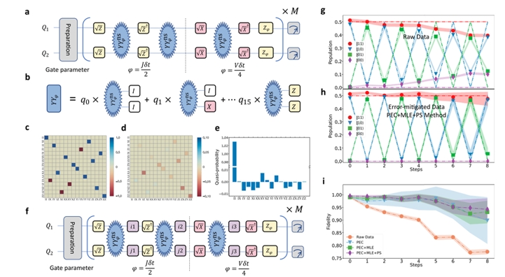 Figure 1 Error-mitigated quantum computation. (a) Quantum circuit of Trotter expansion for the simulation of dynamics of two spinless fermions. (b) Probabilistic error cancellation scheme. (c) Pauli transfer matrix, (d) Deviation of Pauli transfer matrix, and (e) Quasi-probabilities in the decomposition of the inverse error operations for the experimental gate, which is characterized through quantum process tomography. (g) Experimental data and (h) error-mitigated data for V=2J. (i) Population fidelity of experiment data and error-mitigated data