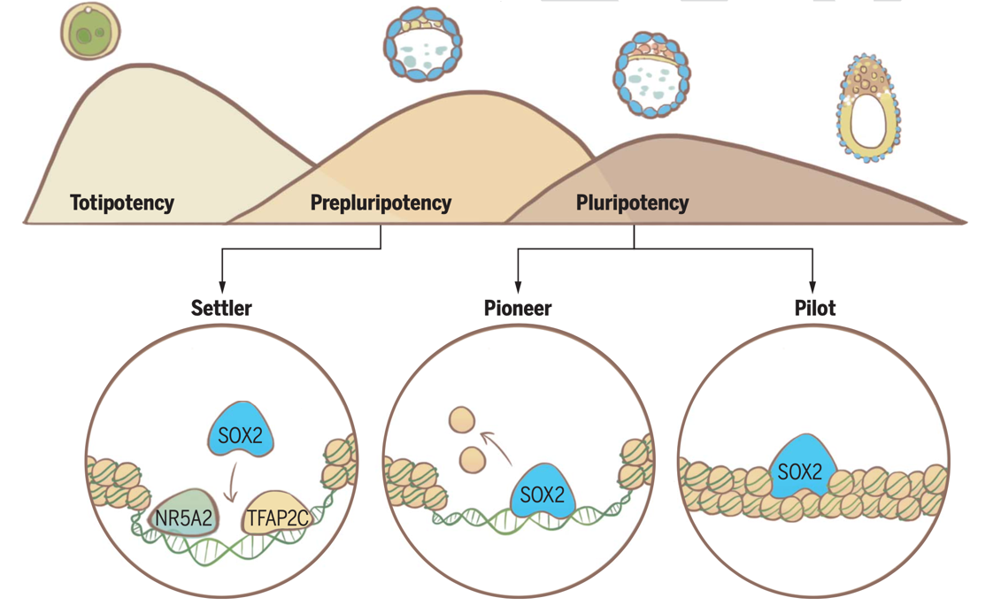 In summary, this study reveals how key transcription factors drives pluripotency programs in vivo and how pioneer factor exert their impacts through “settler-pioneer-pilot” chromatin interactions rather than a simple “pioneer” binding mode. A distinctive “pre-pluripotency” state was also identified in early blastocysts when the pluripotency network is still primitive and pluripotency key factors have not established dominant roles and their inter-dependency to maintain the pluripotency network. This data will lay the foundation for a better understanding of molecular control underlying pluripotency and cell fate determination, and the nature of in vivo and in vitro pluripotency models.