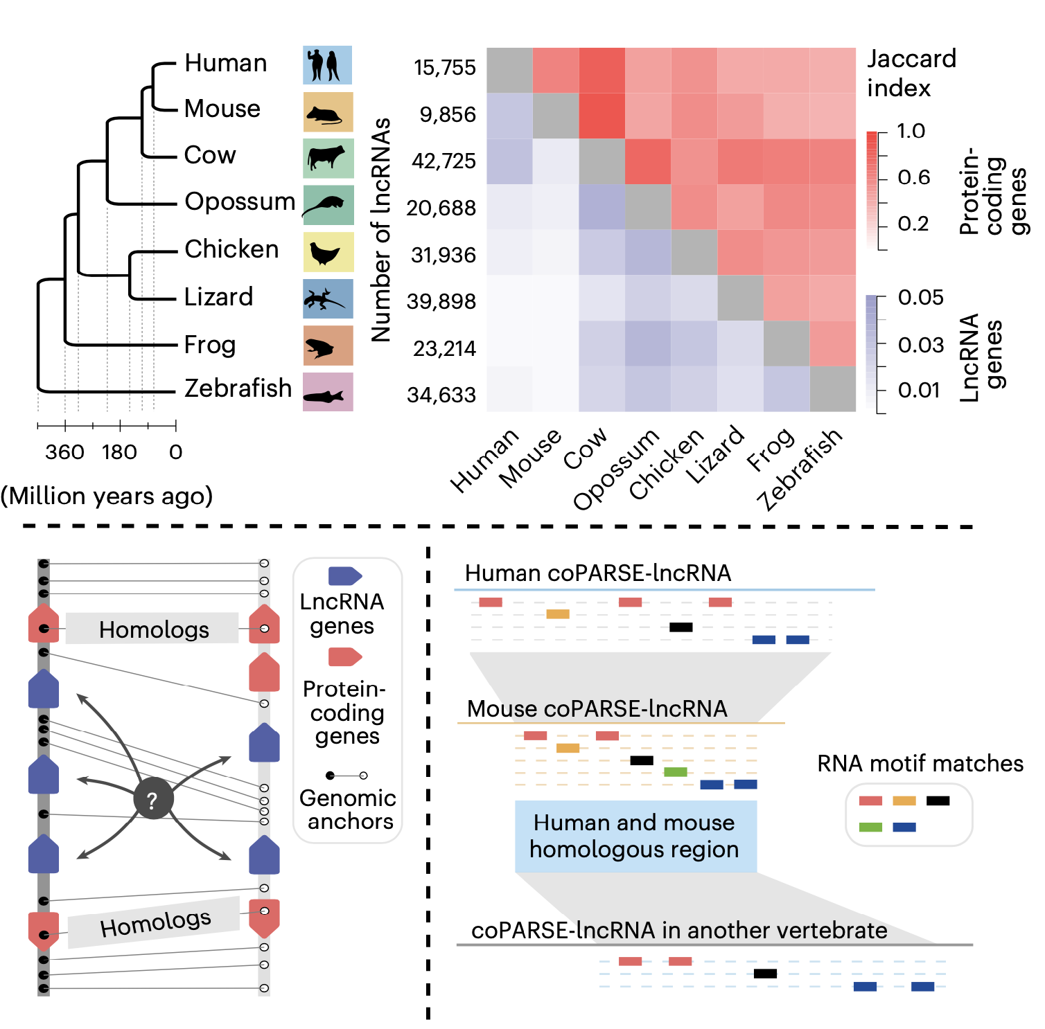 Long non-coding RNAs (lncRNAs) have emerged as important regulators in various physiological processes and disease, including development and tumorigenesis1-3. Despite their significance, the functions of most lncRNAs remain unknown. Homologous lncRNAs that are conserved across different species are more likely to possess important functions. However, due to the low sequence conservation of lncRNAs4,5, traditional sequence alignment methods can only identify a limited number of homologous lncRNAs between species. For instance, there are tens of thousands of lncRNAs in human and zebrafish, only a few dozen homologous lncRNAs can be identified through sequence alignment. There is, therefore, an urgent need for a new method to identify homologous lncRNAs.