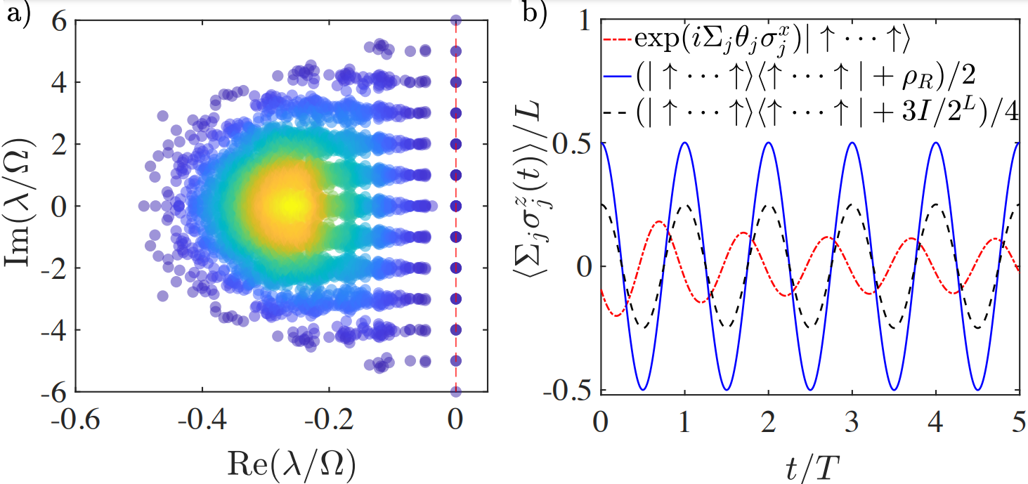 Figure 2:Numerical results for the Liouvillian spectrum and dissipative scarred dynamics