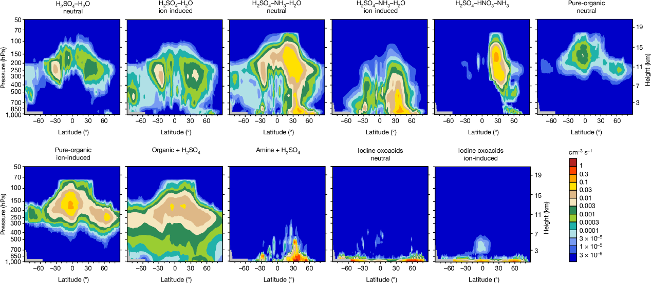 Based on the new model and considering the constraints of observation data, a comprehensive picture of the NPF mechanisms all over the world is presented, demonstrating that the NPF mechanisms vary significantly with region and altitude. Taking the areas with high aerosol concentration or large aerosol radiative forcing as an example, the simulation results demonstrate that pure-organic nucleation dominates at high altitudes in tropical rainforests (Amazon, Central Africa, Southeast Asia, etc.) (Figure 1b); for anthropogenically polluted regions (China, the United States, India, and Europe), amine-H2SO4 nucleation is most likely to dominate near the surface, and H2SO4-HNO3-NH3 nucleation is likely to be the most significant mechanism at high altitudes in Asian monsoon regions such as China and India (Figure 2b); For the Pacific Ocean and the Atlantic Ocean, iodine oxoacids nucleation dominates near the surface, while organic-H2SO4 nucleation and H2SO4-NH3-H2O neutral nucleation are most likely to dominate at high altitudes (Figure 3b). The distribution of global zonal mean NPF rate is largely governed by the hotspot regions above (Figure 4). In the tropical upper troposphere, NPF is dominated by organic-mediated nucleation, especially pure-organic ion-induced nucleation that dominates above the altitude of 11 km. This reflects the NPF mechanisms over the rainforests and tropical oceans. In the boundary layer, amine–H2SO4 nucleation dominates in mid-latitude areas of the Northern Hemisphere, characteristic of anthropogenically polluted regions; iodine oxoacids nucleation dominates at other latitudes because of the vast oceans.