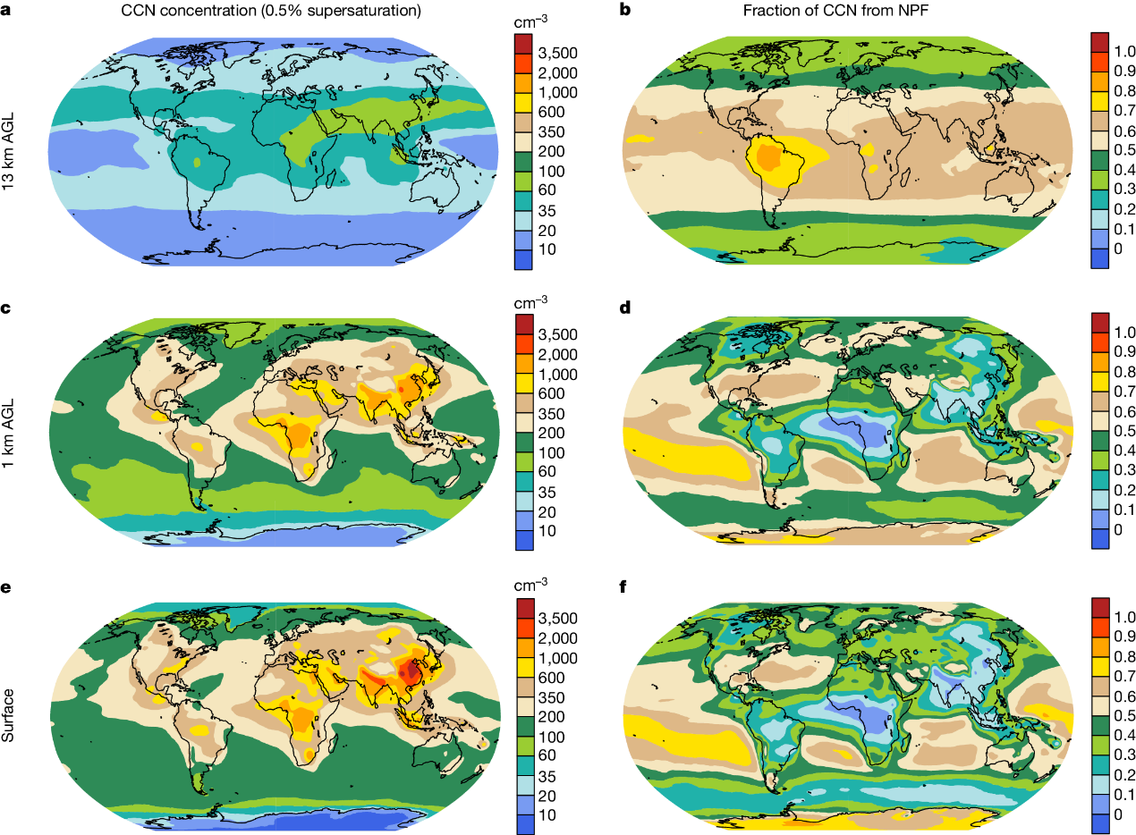 Besides the regional variability of NPF mechanisms, the contribution of NPF to cloud condensation nuclei also shows significant regional differences. For example, at the altitude of 1 km, where low clouds often appear, the contribution of NPF to cloud condensation nuclei under 0.5% supersaturation is between 10% and 80% (Figure 5).