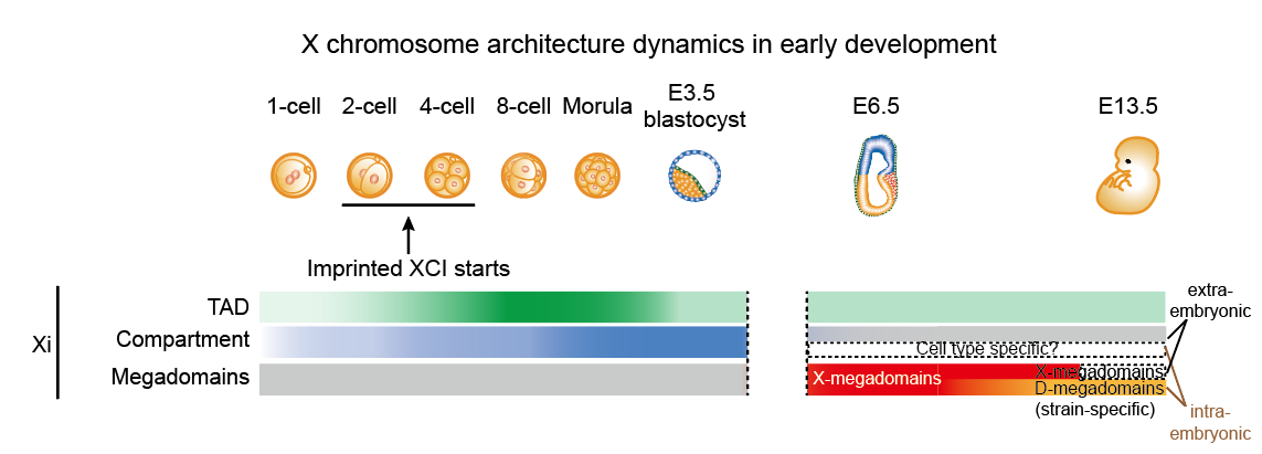 In mice, the paternally inherited X chromosome (Xp) is selectively silenced. Such imprinted XCI initiates around the four-cell stage and the inactivation of the Xp is stably maintained in extraembryonic tissues. By contrast, Xp in embryonic epiblast cells is reactivated, followed by random inactivation of one of the two X chromosomes (random XCI). This study systematically examined the 3D chromosome structure of the X chromosome across the early mouse development from 1-cell embryos to E9.5 extraembryonic cells and E13.5 embryonic cells, spanning the establishment and maintenance of imprinted XCI and random XCI. The researchers revealed that while TADs and compartments diminished from the Xi, a unique Xist-separated megadomain structure (X-megadomains) emerged on the Xi in mouse extraembryonic lineages, and transiently in the embryonic lineages. Previously reported Dxz4-delineated megadomains only appeared at later stages in some mouse strains but were completely absent in other mouse strains. X-megadomains were also observed in in vitro cultured extraembryonic endoderm (XEN) cells and were validated by 3D DNA/RNA FISH.