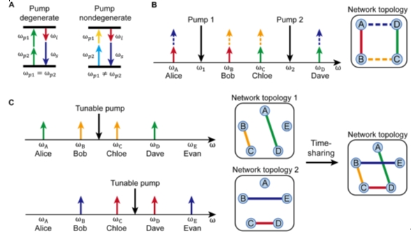 Recently, Professor Wei Zhang from Tsinghua’s Department of Electronic Engineering proposed a reconfigurable quantum entanglement distribution network based on a silicon photonic integrated four-wave mixing quantum light source. By introducing a pump management mechanism, the number of wavelength channels required for an N-user network is reduced to O(N) (compared to O(N²) in traditional WDM-based quantum entanglement distribution networks). This network also possesses strong capabilities on network reconfiguration while ensuring that each pair of user lines independently and utilizes a single entanglement resource. These features make this network architecture advantageous in terms of scalability, reconfigurability, and high performance.