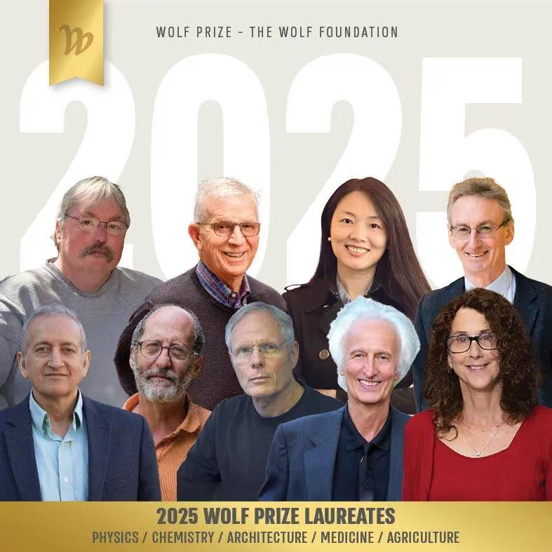 The nine Wolf Prize Laureates in 2025 are Jeffery L. Dangl, Wolf Prize in Agriculture (first row from top, first from left); Brian J. Staskawicz, Wolf Prize in Agriculture (first row from top, second from left); Xu Tiantian, Wolf Prize in Architecture (first row from top, third from left); Jonathan D. G. Jones, Wolf Prize in Agriculture (first row from top, forth from left); Jainendra K. Jain, Wolf Prize in Physics (second row from top, first from left); James P. Eisenstein, Wolf Prize in Physics (second row from top, second from left); Mordehai (Moty) Heiblum, Wolf Prize in Physics (second row from top, third from left); Helmut Schwarz, Wolf Prize in Chemistry (second row from top, fourth from left); Pamela J. Bjorkman, Wolf Prize in Medicine (second row from top, fifth from left).