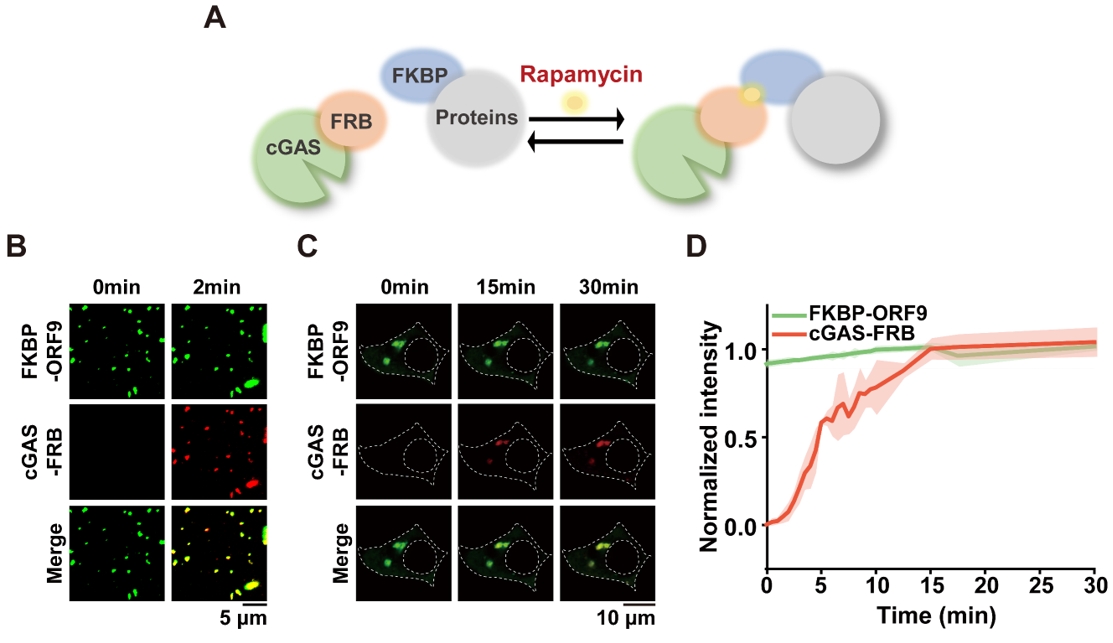 Based on the mechanistic insights, the research team proposed to regulate cGAS phase separation and activity by modulating the interactions between cGAS and accessory proteins. The chemical compound rapamycin can induce interactions between the protein domains FKBP and FRB. The researchers used rapamycin to regulate the affinity between FKBP proteins and cGAS-FRB, enabling cGAS to form droplet-like structures within two minutes. In addition, this chemical-inducible system successfully induced rapid phase separation of cGAS in living cells within 5-15 minutes and significantly enhanced its activity.