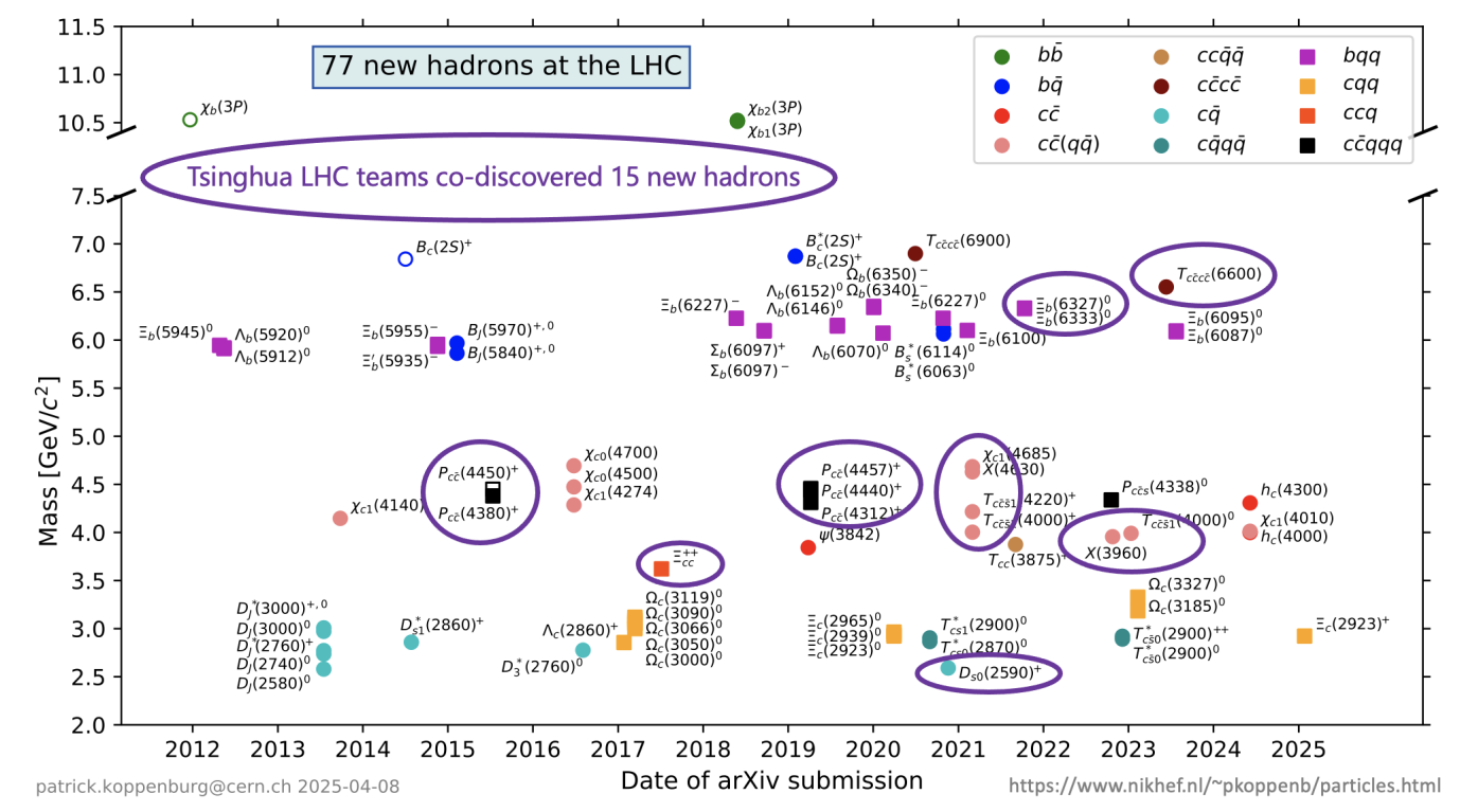 Fig. 2. 77 new hadrons have been discovered at the LHC, with 69 observed by the LHCb experiment and the remaining 8 by the ATLAS and CMS experiments. The LHCb team from the Department of Engineering Physics at Tsinghua University co-discovered 14 new hadrons, while the CMS team from the Department of Physics at Tsinghua University co-discovered one new hadron.