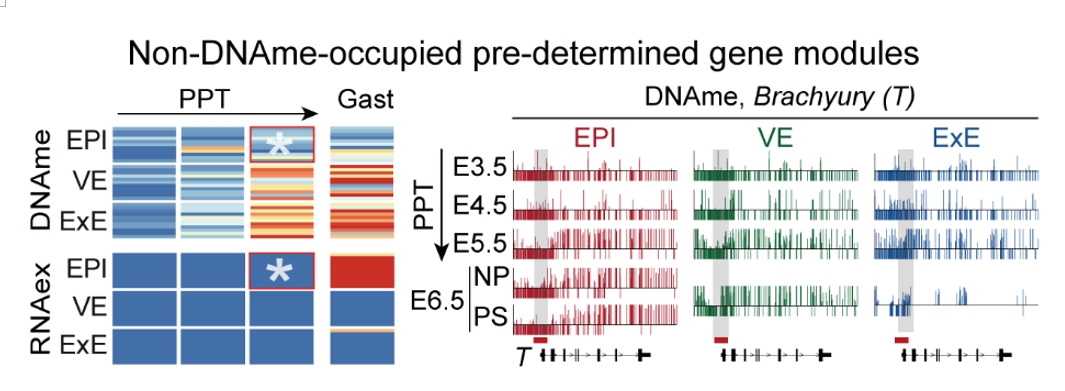 Analysis of differentially methylated regions (DMRs) revealed a set of EPI-specific hypomethylated promoters at E5.5 whose associated genes are significantly enriched in key developmental pathways active at E6.5, most notably gastrulation. The canonical gastrulation-related gene Brachyury (T) exemplifies this pattern: its promoter acquires an EPI-specific hypomethylated state by E5.5 and is subsequently activated specifically within the primitive streak (PS) at E6.5. In contrast, VE-specific or ExE-specific hypomethylated promoters are linked to genes enriched in digestive-system morphogenesis and placental development. Collectively, these lineage-specific hypomethylated promoters appear to pre-configure gene regulatory switches through an “epigenetic pre-programming” mechanism, thereby constraining differentiation toward non-target lineages and ensuring faithful lineage segregation (Figure 3).