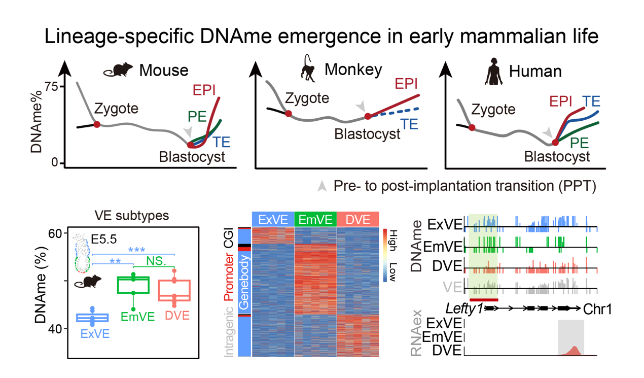 Using multi-omics sequencing, the research group selected single cells from mouse embryos spanning E3.5 to E5.5 for DNA methylation (DNAme) profiling. The results revealed a dramatic global increase in DNAme across all lineages after implantation, with the embryonic lineage—epiblast (EPI)—showing both faster and higher levels of de novo methylation compared to extraembryonic lineages, visceral endoderm (VE) and extraembryonic ectoderm (ExE). Across mouse, monkey, and human embryos, a wave of global demethylation reaches its lowest point around implantation, after which lineage-specific DNAme patterns are re-established. Moreover, subpopulations of VE exhibit distinct DNAme profiles across genomic elements and at genes specifically expressed in each VE subtype, indicating that VE subtypes with the segregated lineage fates possibly underwent their own DNAme dynamics (Figure 1).