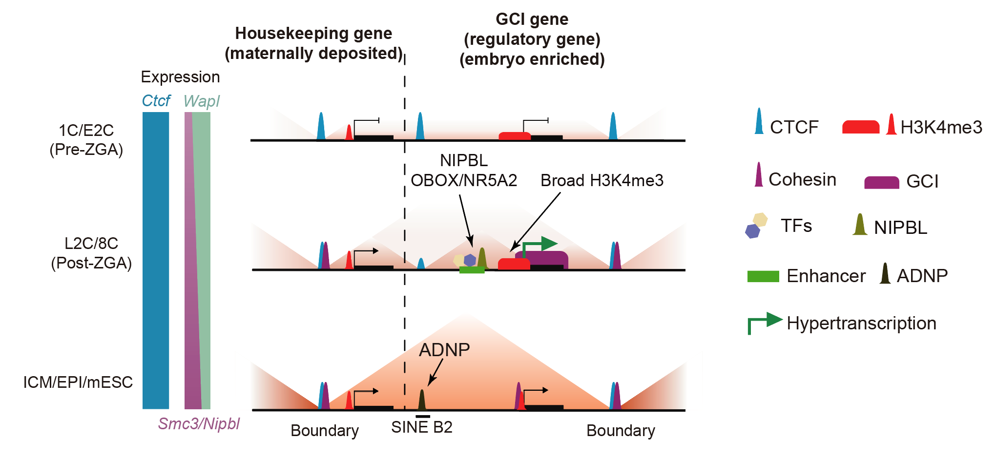 Figure 1. De novo establishment of chromatin architecture and its interplay with hypertranscription in early mouse embryos