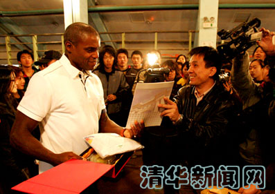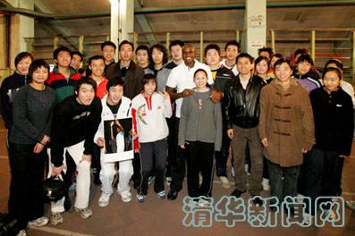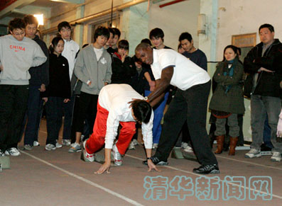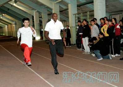 World-famous athlete Carl Lewis visited Tsinghua and had a face-to-face communication with students of Tsinghua Track and Field Team on January 29. He encourage the students to work hard, “Never give in”, and realize their dreams in the Beijing 2008 Olympic Games.