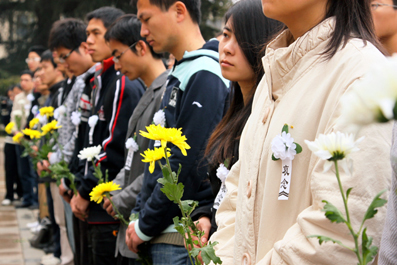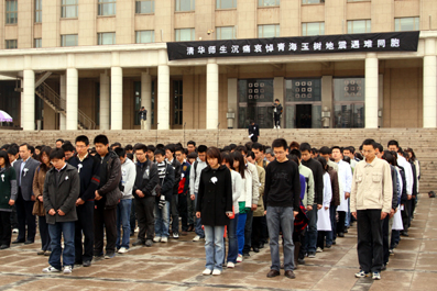 A magnitude 7.1 earthquake struck Yushu County in northwest China's Qinghai Province on April 14. Tsinghua University students as well as members of the faculty and staff mourned together on April 21 those who were killed in the devastating earthquake.