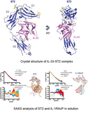 IL-33 is the latest member of IL-1 cytokine family that has pleiotropic activities in innate and adaptive immune responses in host defense and disease. The biological function of IL-33 is mediated by its specific receptor ST2 and co-receptor IL-1RAcP on the target cell membrane. The authors determined the crystal structure of mature IL-33 (amino acid residues 112-270) complexed with the extracellular domain of ST2 receptor. Coupled with structure-based mutagenesis and binding assay, the structural results define the molecular mechanism by which ST2 specifically recognizes IL-33. Structural comparison with other ligand-receptor complexes in the IL-1 family indicates that surface charge complementarity is critical in determining ligand-binding specificity of IL-1 primary receptors. Combined crystallography and small-angle X-ray scattering (SAXS) studies reveal that ST2 possesses hinge flexibility between the D3 domain and D1D2 module, while IL-1RAcP exhibits a rigid conformation in the unbound state in solution. The molecular flexibility of ST2 provides structural insights into domain-level conformational change of IL-1 primary receptors upon ligand binding, and the rigidity of IL-1RAcP explains its inability to bind ligands directly. The solution architecture of IL-33-ST2-IL-1RAcP complex from SAXS analysis resembles IL-1β-IL-1RII-IL-1RAcP and IL-1β-IL-1RI-IL-1RAcP crystal structures. The collective results confer IL-33 structure-function relationships, supporting and extending a general model for ligand-receptor assembly and activation in the IL-1 family proposed in their Nature Immunology paper published in 2010.