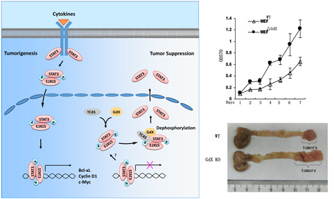 After stimulation of tumor cells by cytokines, STAT3 was activated and induced the expression of tumor related genes, resulting in tumorigenesis. A protein with ubiquin-like domain named GdX specifically bridge a phosphatase called TC45 to STAT3 and induced a process of dephosphorylation of STAT3, finally leading to de-activation of STAT3 and inhibition of tumor growth (Left). When GdX was depleted, tumor cells grow faster significantly (Right upper). The mouse with depletion of GdX demonstrated more colon tumors induced (Right bottom).