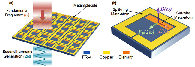 Figure 1: Schematics of the nonlinear metamolecule array (a) and single metamolecule (b).