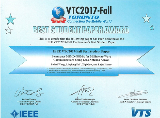 From Sep 24th to 27th, the 2017 IEEE 86th Vehicular Technology Conference (IEEE VTC 2017-Fall) was held in Toronto, Canada, hosted by the Institute of Electrical and Electronics Engineers (IEEE). The paper, entitled Beamspace MIMO-NOMA for Millimeter-Wave Communications Using Lens Antenna Arrays, with Bichai Wang, PhD candidate from the Department of Electronic Engineering of Tsinghua University as its first author, won the only IEEE VTC 2017-Fall Best Student Paper Award.