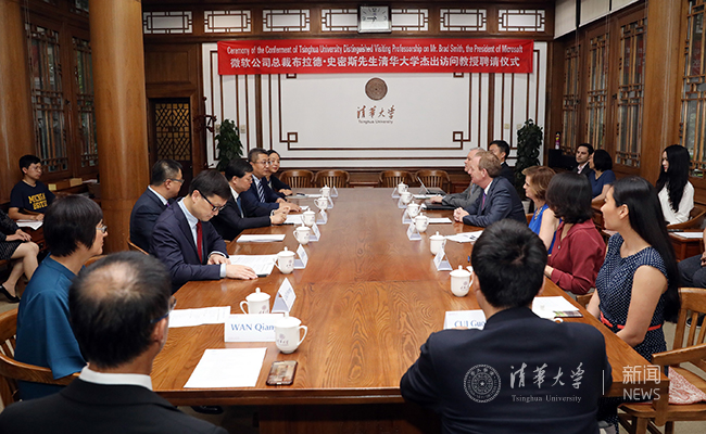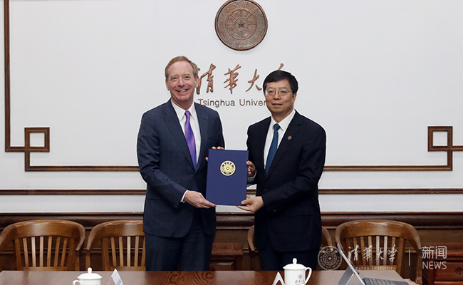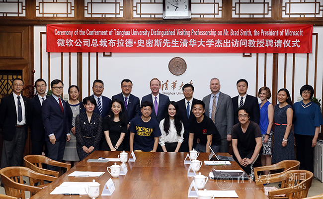 Brad Smith is Microsoft’s president and has visited Tsinghua University twice before. At the ceremony, President Qiu Yong conferred the honor to him. “Tsinghua University is one of the top universities in China and a world-famous institution of higher education,” said Brad Smith. “I feel honored to be a distinguished visiting professor of Tsinghua University and I look forward to continuing our work together in the future."
