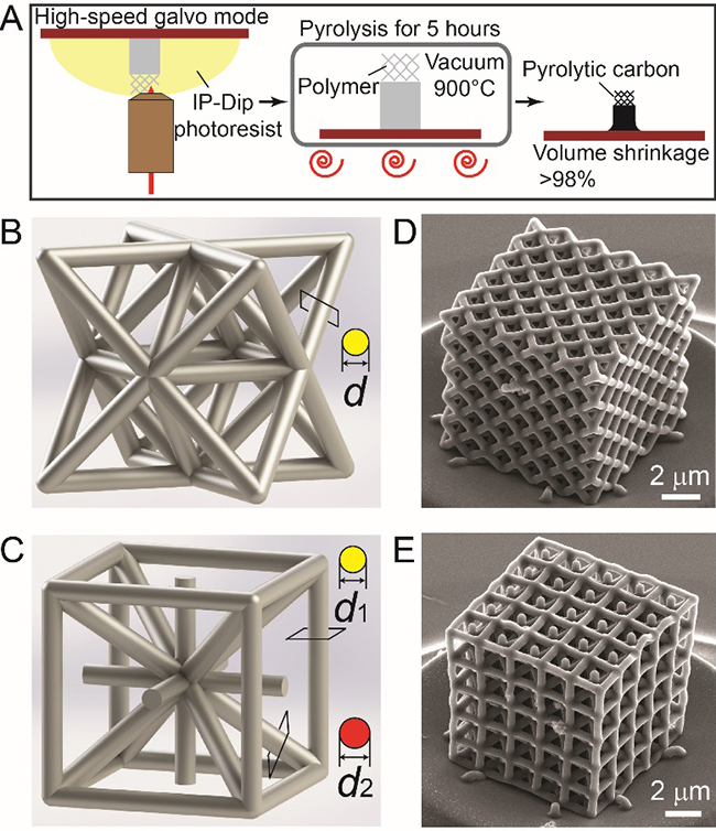 A long-standing challenge in modern materials design is to create low-density materials that are robust against defects and can withstand extreme thermomechanical environments because these properties typically are mutually exclusive: the lower the density, the weaker and more fragile the material. In this paper, Prof. Li’s group collaborated with the groups of Prof. Gao andP Prof. Greer, and demonstrated the creation of pyrolytic carbon nanolattices with stretching-dominated octet- and iso-truss topologies by a two-step procedure: direct laser writing and pyrolysis at high temperature (see Fig. 1). The unit cells of these nanolattices had the same dimensions of approximately 2 m, and the diameters of the individual struts in the lattices varied from 261 nm to 679 nm. The smallest characteristic size of the struts approached the limits of resolution of the available three-dimensional lithograph technologies. In situ scanning electron microscopy and ex situ compressive testing revealed that these pyrolytic carbon nanolattices have a compressive strength of up to 1.90 GPa at a density below 1.0 g/cm3 (see Fig. 2A). As a result, the pyrolytic carbon nanolattices achieved an exceptional specific strength (i.e., ratio of strength to density) of 1.90 GPa g-1 cm3, which is 1-3 orders of magnitude higher than those of nearly all micro/nanolattices reported so far. Such specific strength of our nanolattice is about 35% of that (5.60 GPa g-1 cm3) of diamond, which has the highest specific strength of all bulk materials.