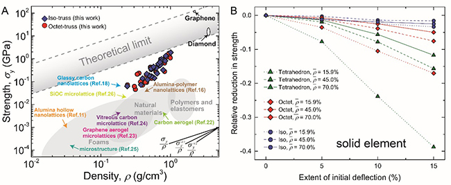 The compression experiments also showed that these octet- and iso-truss nanolattices have the average fracture strains of 14.0% and 16.7%, respectively, which are larger than those of various brittle nanolattices reported previously. More remarkably, these nanolattices become insensitive to fabrication-induced defects (see Fig. 2B), allowing them to attain nearly theoretical strength of the constituent material. The combination of ultra-low density, ultra-high strength and specific strength, large fracture strain and flaw insensitivity of these pyrolytic carbon nanolattices are attributed to the miniaturization (nanosized beams) of the overall structure and the optimization of the lattice topology. This study provides a feasible pathway for scalable fabrication of robust nanoarchitected with defect tolerance, ultralight weight, and superior strength.