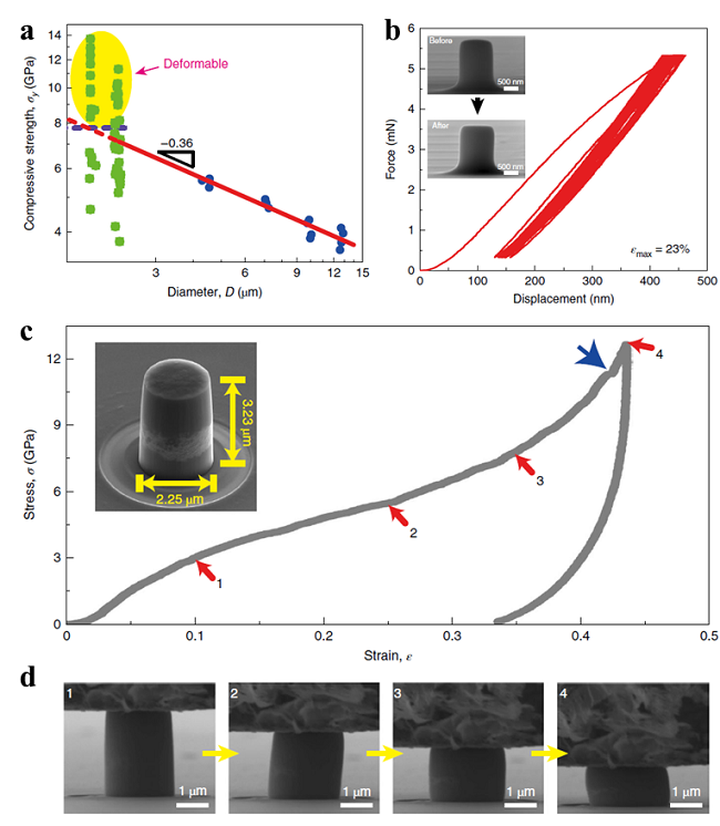 Figure 1. Mechanical behaviors of micro-sized pyrolytic carbon. (a) Variation of compressive strength with diameter of pyrolytic carbon specimens, (b) Force-displacement curve from cyclic loading with a maximum compressive strain of ~23%; (c) Typical stress-strain curve of pyrolytic carbon micropillars with diameter less than 2.3 ?m, and (d) SEM images of tested specimens during in-situ compression.