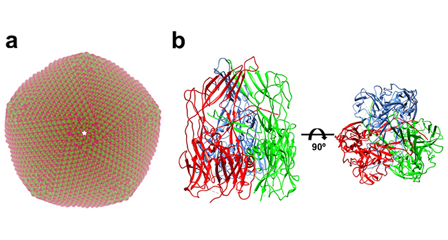 Figure 1. a. A simulated capsid of the African Swine Fever virus. b. Structure of the African Swine Fever virus major capsid protein p72.