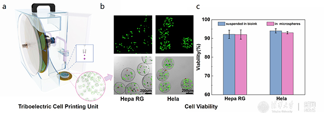 Jia Cheng’s and Rui Yao’s groups worked together to develop a triboelectric cell printing system, which consists of a freestanding-rotating-disk TENG (FRD-TENG), a voltage multiplier rectifying circuit (VMRC) and basic setup for cell printing. The FRD-TENG along with the VMRC delivered a direct-current high-voltage of 5-8 kV and then generated microsphere with uniform and spherical shape with an average diameter of 300 μm. HepaRG and Hela cells were mixed in materials for culture and achieved viability rates of more than 92% after printing. At the same time, the charge (34.40±4.48 pC) of the microspheres generated by TENG was lower and more stable than that of a commercially available power supplier (42.40±19.66 pC), demonstrating the advantage of electrosensitive cell printing. In addition, electrical analysis and multiple physical field simulation in COMSOL were conducted to uncover the mechanisms of the triboelectric cell printing method. Factor experiments were then conducted to determine the appropriate set-up for later research on 3-D cell culture. This method enriched the diversity of the cell printing process and can be conveniently utilized in bioprinting and biomanufacturing directly by mechanical energy stimuli in the future. It has a technical competitive advantage in the event that a traditional power supply is not available.