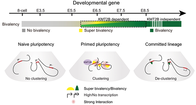 Around implantation, epiblast cells transit from naive to primed pluripotency, and further give rise to three germ layers, including ectoderm, mesoderm and endoderm. This provides the foundation of the entire body development. Yet how chromatin reconfigures during this critical developmental window in vivo remains elusive. By integrating genome-wide investigation of histone modifications, chromatin accessibility, and 3D chromatin architecture during this period, the researchers discovered that enhancers in ectoderm, but not for endoderm or mesoderm, are already pre-accessible in E6.5 epiblast, supporting the notion that ectoderm is the default fate for epiblast. Interestingly, they found that unusually strong H3K4me3 emerges at developmental gene promoters specifically in E6.5 epiblast and E7.5 ectoderm, but not for earlier stages and committed lineages. Together with H3K27me3, these promoters form super bivalency. Furthermore, super bivalency marked developmental genes showed strong spatial interactions specifically in E6.5 epiblast. To investigate how super bivalency is established and regulated, the researchers knocked out Kmt2b, which encoded a methyltransferase specifically catalyzing bivalent H3K4me3, in zygote. They found that deficiency of KMT2B leads to loss of H3K4me3, reduced spatial clustering in E6.5 epiblast and impaired subsequent activation for a subset of developmental genes, ultimately resulting in embryonic lethality. Thus their study provided comprehensive spatiotemporal views for the dynamic chromatin architecture in mouse post-implantation embryos, and further revealed super bivalency and its function in regulating key developmental gene activation during early cell fate commitment.