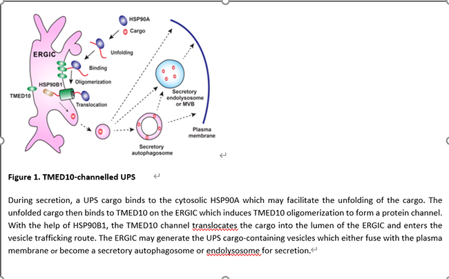 Researchers from the GE lab in the School of Life Sciences at Tsinghua University found a protein translocation pathway regulating UPS cargo entry into the vesicle carrier. A transmembrane protein TMED10 was identified as a regulatory factor for the secretion of multiple cargoes, including the mature form of interleukin 1(IL1) family members and a set of other UPS cargoes (HSPB5, Galectin-1/3 and Annexin A1). TMED10 directly facilitates the translocation of leaderless cargos into the ER-Golgi intermediate compartment (ERGIC) via its C-terminal tail binding to a certain motif, likely to be a UPS signal peptide, in the cargoes, the process of which is dependent upon protein unfolding and enhanced by chaperones HSP90A/HSP90AB1 and HSP90B1/GRP94. Furthermore, the cargo triggers oligomerization of TMED10, which is likely to then form a protein channel on the membrane to translocate the UPS cargoes into the vesicle (Figure 1). The pathway identified was termed TMED10-channelled UPS (THU). It is likely that THU acts together with the well-known SRP-SEC61 pathway to govern two types of protein secretion e.g. unconventional and conventional secretion respectively.